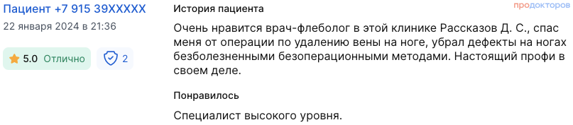 В любимой клинике появился флеболог! Сразу же записалась к Рассказову - очень грамотный врач. После курса склеротерапии ноги стали выглядеть гораздо м...