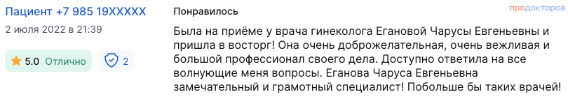 Была на приёме у врача гинеколога Егановой Чарусы Евгеньевны и пришла в восторг! Она очень доброжелательная, очень вежливая и большой профессионал своего дела. Доступно ответила на все волнующие меня вопросы. Еганова Чаруса Евгеньевна замечательный и грамотный специалист! Побольше бы таких врачей!