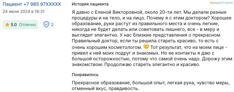 Я давно с Еленой Викторовной, около 20-ти лет. Мы делали разные процедуры и на тело, и на лицо. Почему я с этим доктором? Хорошее образование, руки растут из правильного места и очень легкие, никогда не будет делать или советовать лишнего, все - в меру и выглядит элегантно. У нас близкие представления о прекрасном. Правильный доктор, если ты решила стареть красиво, то есть с очень хорошим косметологом. :) Тот результат, что на моем лице - привел к ней моих подруг и знакомых. Но ее контакты я даю с большой осторожностью, потому что самой очень надо. Дорожу этим знакомством. Продолжаю стареть элегантно и красиво.