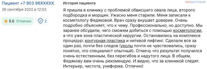 Я пришла в клинику с проблемой обвисшего овала лица, второго подбородка и морщин. Ужасно меня старили. Меня записали к косметологу Федяковой. Врач сразу внушает доверие. Очень подробно объясняет, что к чему. Профессионально, но доступно. Мы заранее обсудили, чего сможем добиться с помощью косметологии, а что уже зона пластической хирургии. Остановились на комплексе процедур: контурная пластика и нитевой лифтинг. Сделали все за один раз, почти без следов (уколы почти не чувствовались, сразу понятно, что специалист опытный). Отмечу что результат получился очень естественным, без перегибов и надутого лица. В общем, Федякову вам очень рекомендую. И видно, что за клиникой следят. Интерьер, чистота, униформа. Отлично!