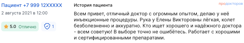 Всем привет, отличный доктор с огромным опытом, делаю у неё инъекционные процедуры. Рука у Елены Викторовны лёгкая, колет безболезненно и аккуратно. Кто ищет хорошего и надёжного доктора - всем советую! В выборе точно не ошибётесь. Работает с хорошими и сертифицированными препаратами.
