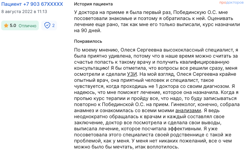 У доктора на приеме я была первый раз, Побединскую О.С. мне посоветовали знакомые и поэтому я обратилась к ней. Оценивать лечение еще рано, так как мне его только выписали, курс назначили на 90 дней.
