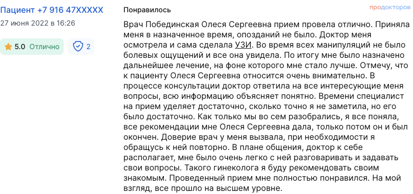 Врач Побединская Олеся Сергеевна прием провела отлично. Приняла меня в назначенное время, опозданий не было. Доктор меня осмотрела и сама сделала УЗИ. Во время всех манипуляций не было болевых ощущений и все она увидела. По итогу мне было назначено дальнейшее лечение, на фоне которого мне стало лучше. Отмечу, что к пациенту Олеся Сергеевна относится очень внимательно. В процессе консультации доктор ответила на все интересующие меня вопросы, всю информацию объясняет понятно. Времени специалист на прием уделяет достаточно, сколько точно я не заметила, но его было достаточно. Как только мы во сем разобрались, я все поняла, все рекомендации мне Олеся Сергеевна дала, только потом он и был окончен. Доверие врач у меня вызвала, при необходимости я обращусь к ней повторно. В плане общения, доктор к себе располагает, мне было очень легко с ней разговаривать и задавать свои вопросы. Такого гинеколога я буду рекомендовать своим знакомым. Проведенный прием мне полностью понравился. На мой взгляд, все прошло на высшем уровне.