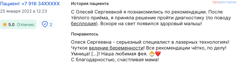 Олеся Сергеевна - мой ангел, благодаря ей я сейчас мама, долго и упорно решала этот вопрос с другими врачами, но получилось только с ней. Самая лучшая...