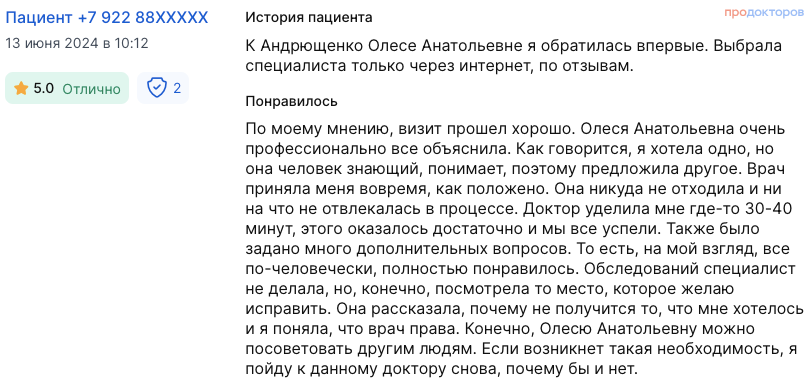 К Андрющенко Олесе Анатольевне я обратилась впервые. Выбрала специалиста только через интернет, по отзывам. По моему мнению, визит прошел хорошо. Олеся Анатольевна очень профессионально все объяснила. Как говорится, я хотела одно, но она человек знающий, понимает, поэтому предложила другое. Врач приняла меня вовремя, как положено. Она никуда не отходила и ни на что не отвлекалась в процессе. Доктор уделила мне где-то 30-40 минут, этого оказалось достаточно и мы все успели. Также было задано много дополнительных вопросов. То есть, на мой взгляд, все по-человечески, полностью понравилось. Обследований специалист не делала, но, конечно, посмотрела то место, которое желаю исправить. Она рассказала, почему не получится то, что мне хотелось и я поняла, что врач права. Конечно, Олесю Анатольевну можно посоветовать другим людям. Если возникнет такая необходимость, я пойду к данному доктору снова, почему бы и нет.