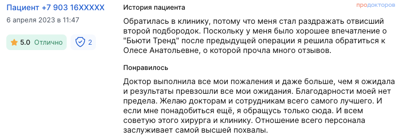 Обратилась в клинику, потому что меня стал раздражать отвисший второй подбородок. Поскольку у меня было хорошее впечатление о "Бьюти Тренд" после предыдущей операции я решила обратиться к Олесе Анатольевне, о которой прочла много отзывов.