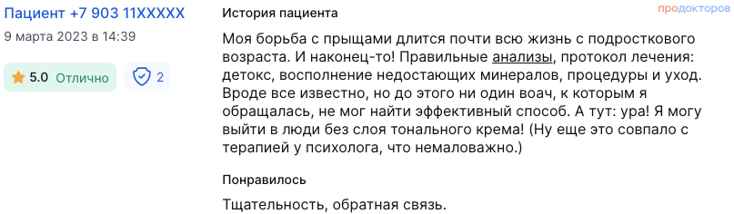 Моя борьба с прыщами длится почти всю жизнь с подросткового возраста. И наконец-то! Правильные анализы, протокол лечения: детокс, восполнение недостающих минералов, процедуры и уход. Вроде все известно, но до этого ни один воач, к которым я обращалась, не мог найти эффективный способ. А тут: ура! Я могу выйти в люди без слоя тонального крема! (Ну еще это совпало с терапией у психолога, что немаловажно.)
