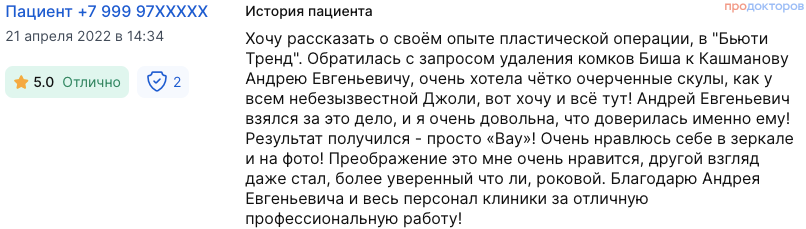 Хочу рассказать о своём опыте пластической операции, в "Бьюти Тренд". Обратилась с запросом удаления комков Биша к Кашманову Андрею Евгеньевичу, очень хотела чётко очерченные скулы, как у всем небезызвестной Джоли, вот хочу и всё тут! Андрей Евгеньевич взялся за это дело, и я очень довольна, что доверилась именно ему! Результат получился - просто «Вау»! Очень нравлюсь себе в зеркале и на фото! Преображение это мне очень нравится, другой взгляд даже стал, более уверенный что ли, роковой. Благодарю Андрея Евгеньевича и весь персонал клиники за отличную профессиональную работу!
