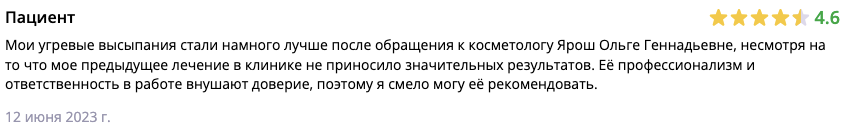 Мои угревые высыпания стали намного лучше после обращения к косметологу Ярош Ольге Геннадьевне, несмотря на то что мое предыдущее лечение в клинике не приносило значительных результатов. Её профессионализм и ответственность в работе внушают доверие, поэтому я смело могу её рекомендовать.